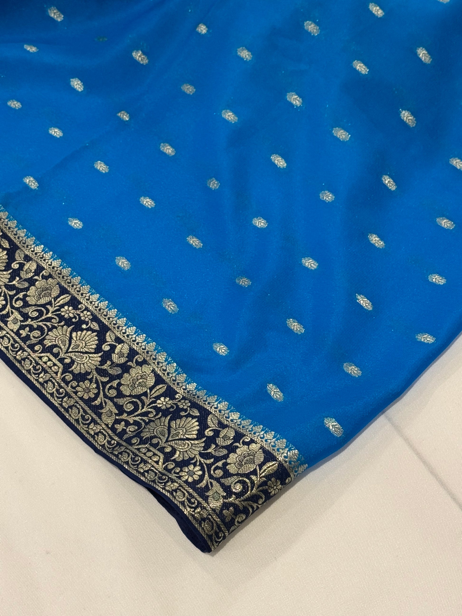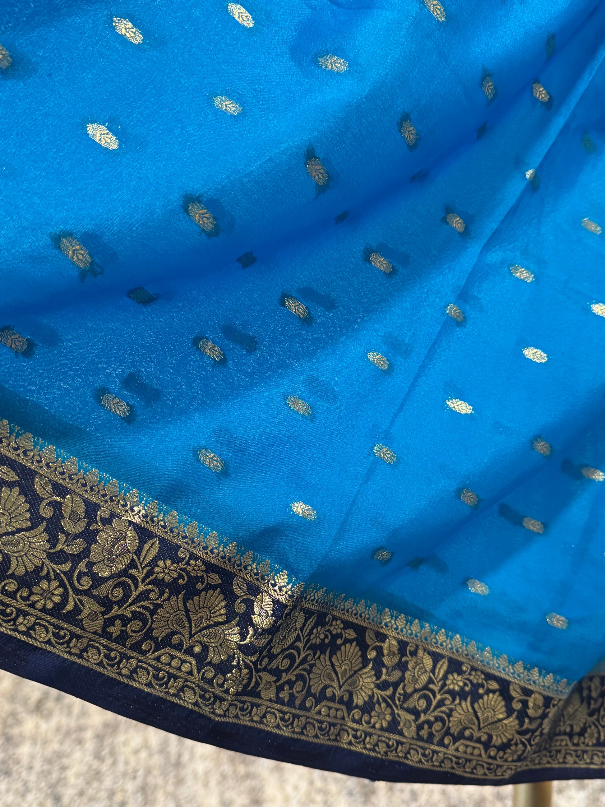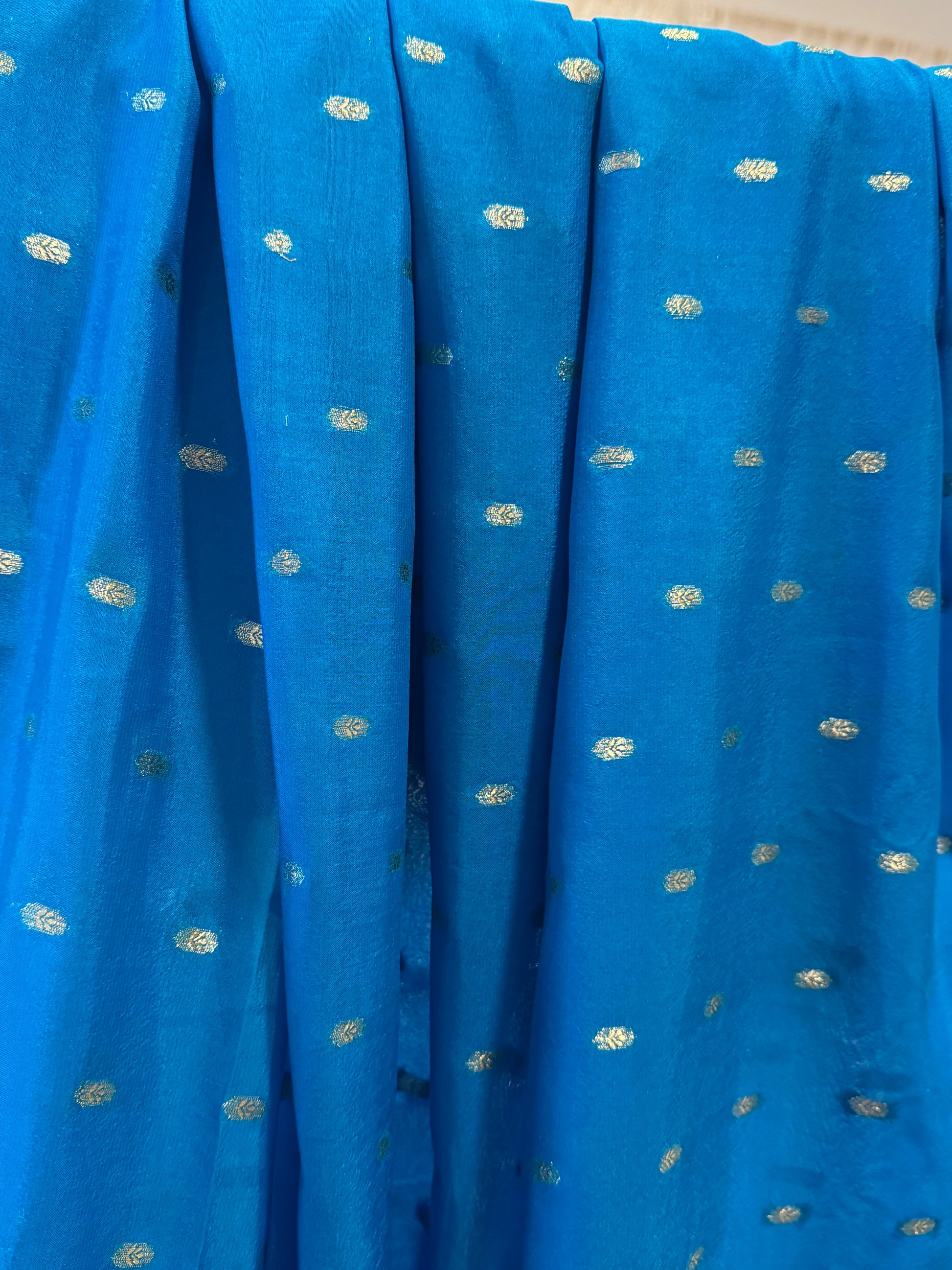 - Color - bright electric blue/turquoise with designs in metallic and contrasting navy.