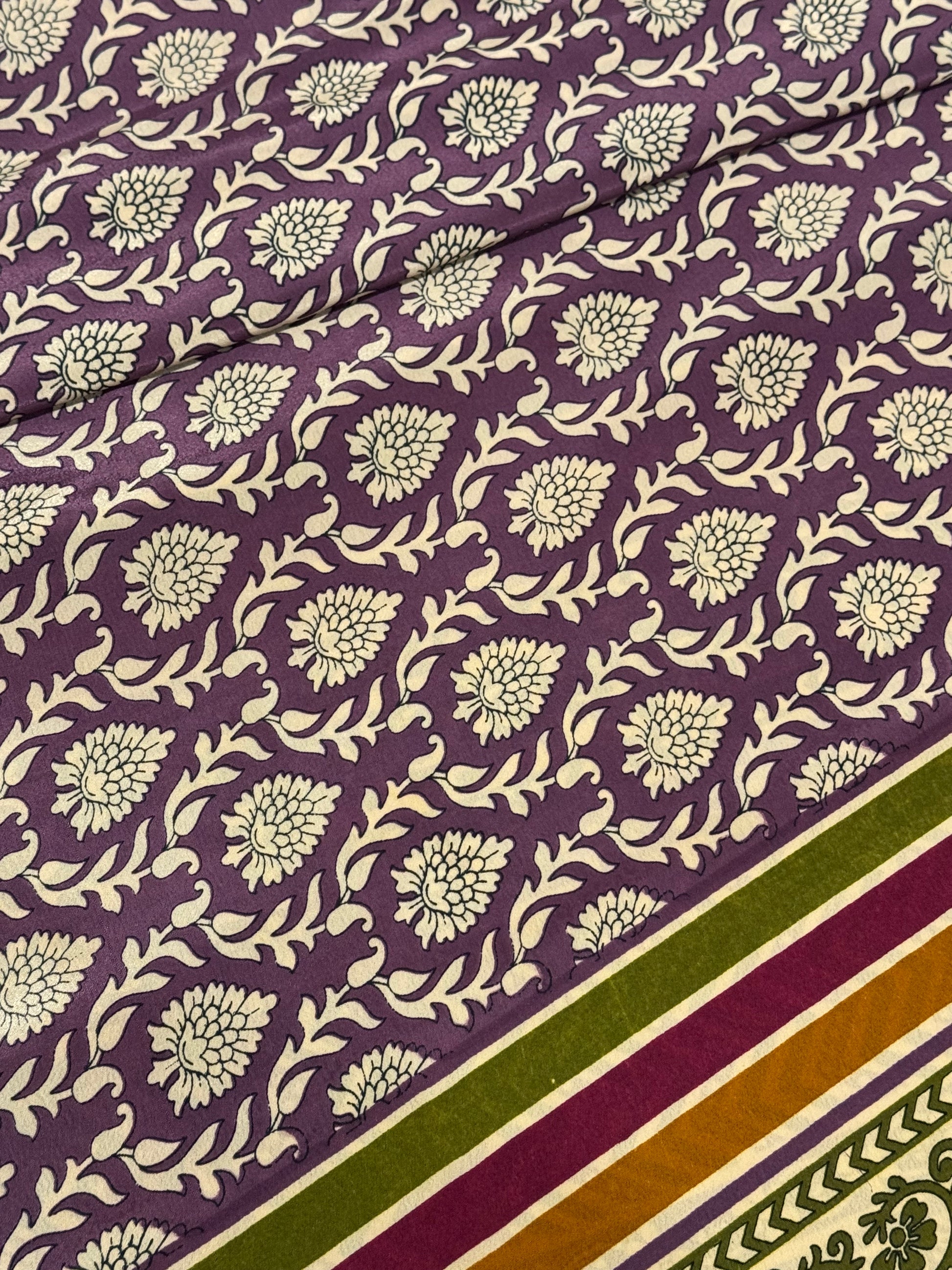 - Color - Light taupe with designs in burgundy, forest green, and purple.